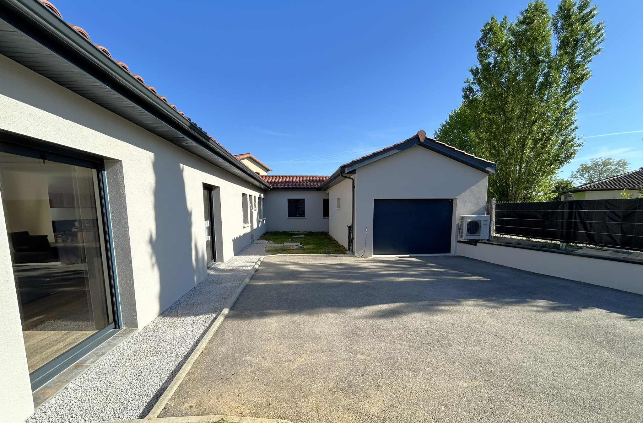 Accolé et attenant un grand garage, et à l’extérieur une terrasse exposée SUD/OUEST, un jardin et une cour en enrobé et le tout sur un terrain d’environ 417 m2.