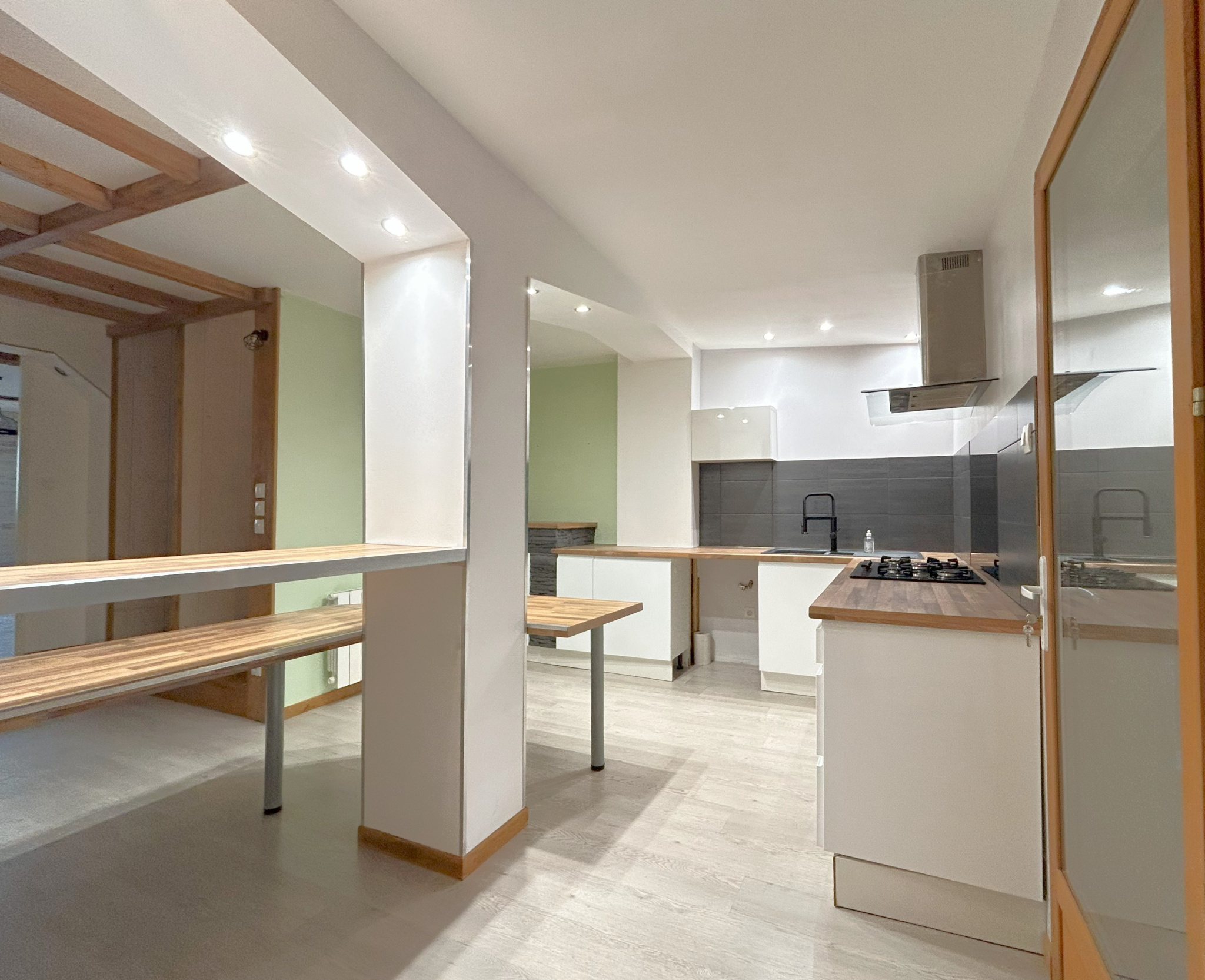 Au premier étage, une cuisine équipée et fonctionnelle, un grand salon/séjour lumineux et un second WC.