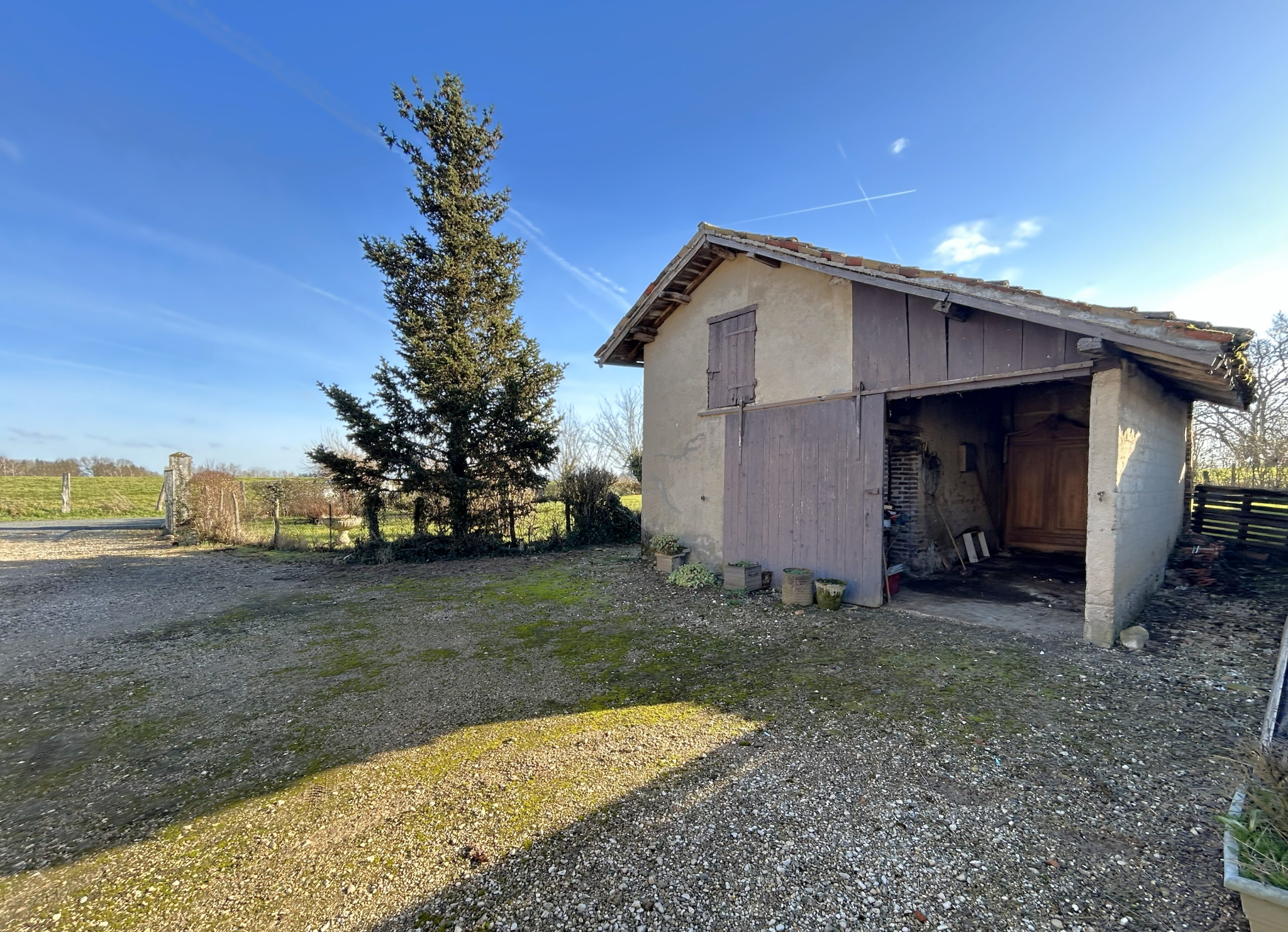 A l’extérieur un auvent couvert (toiture en bon état) exposé SUD, un garage, des anciens cochonniers et attenant un terrain d’envrion 5714 m2 et non attenant (à quelques mètres) un terrain d’environ 17 224 m2.