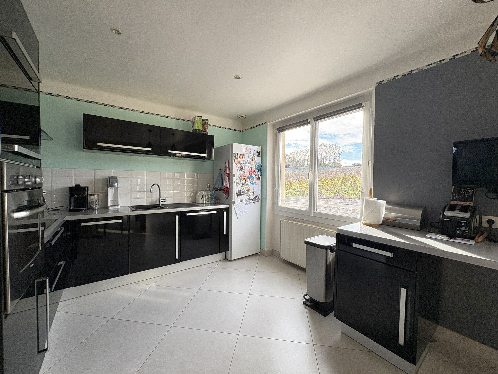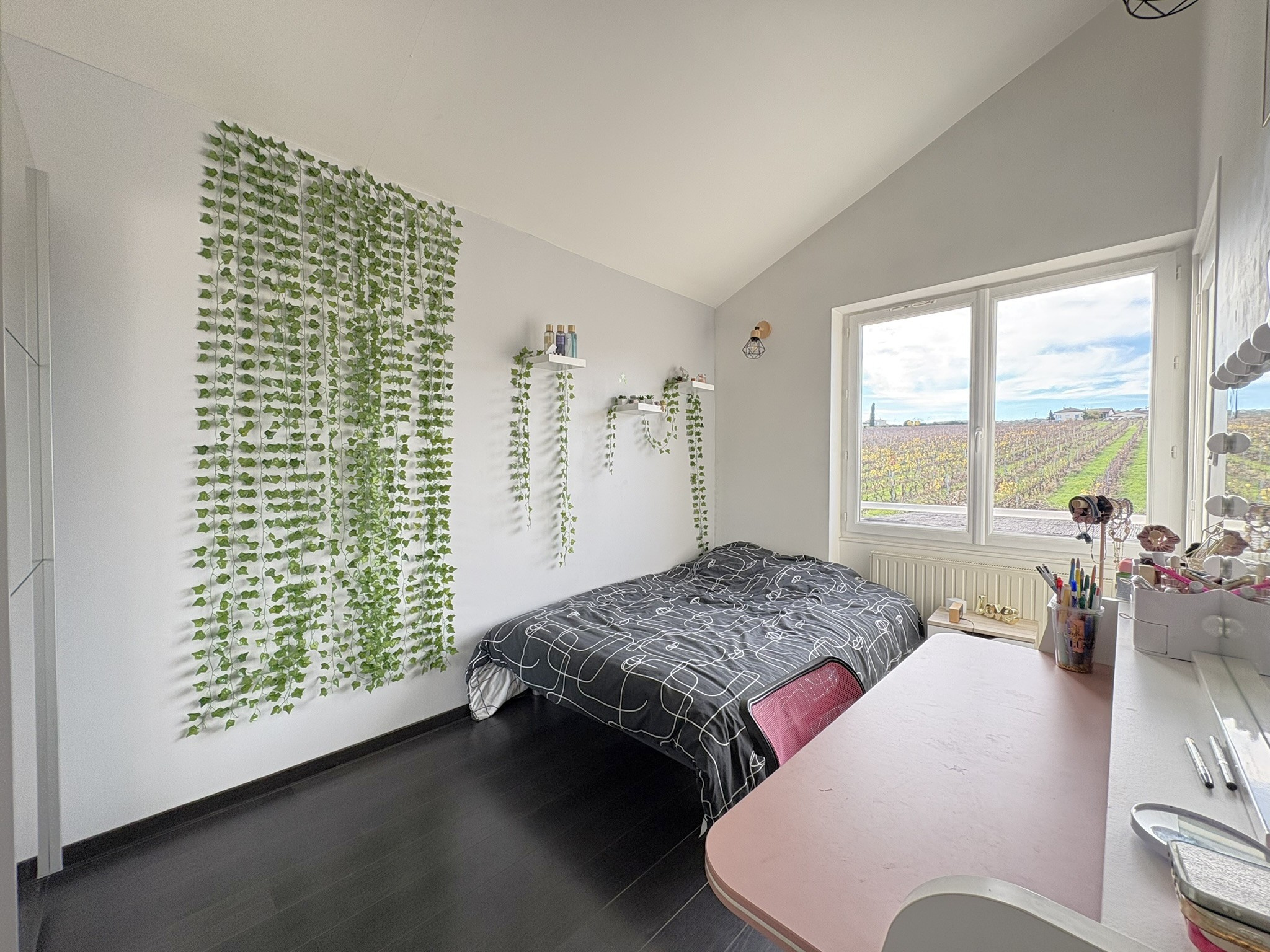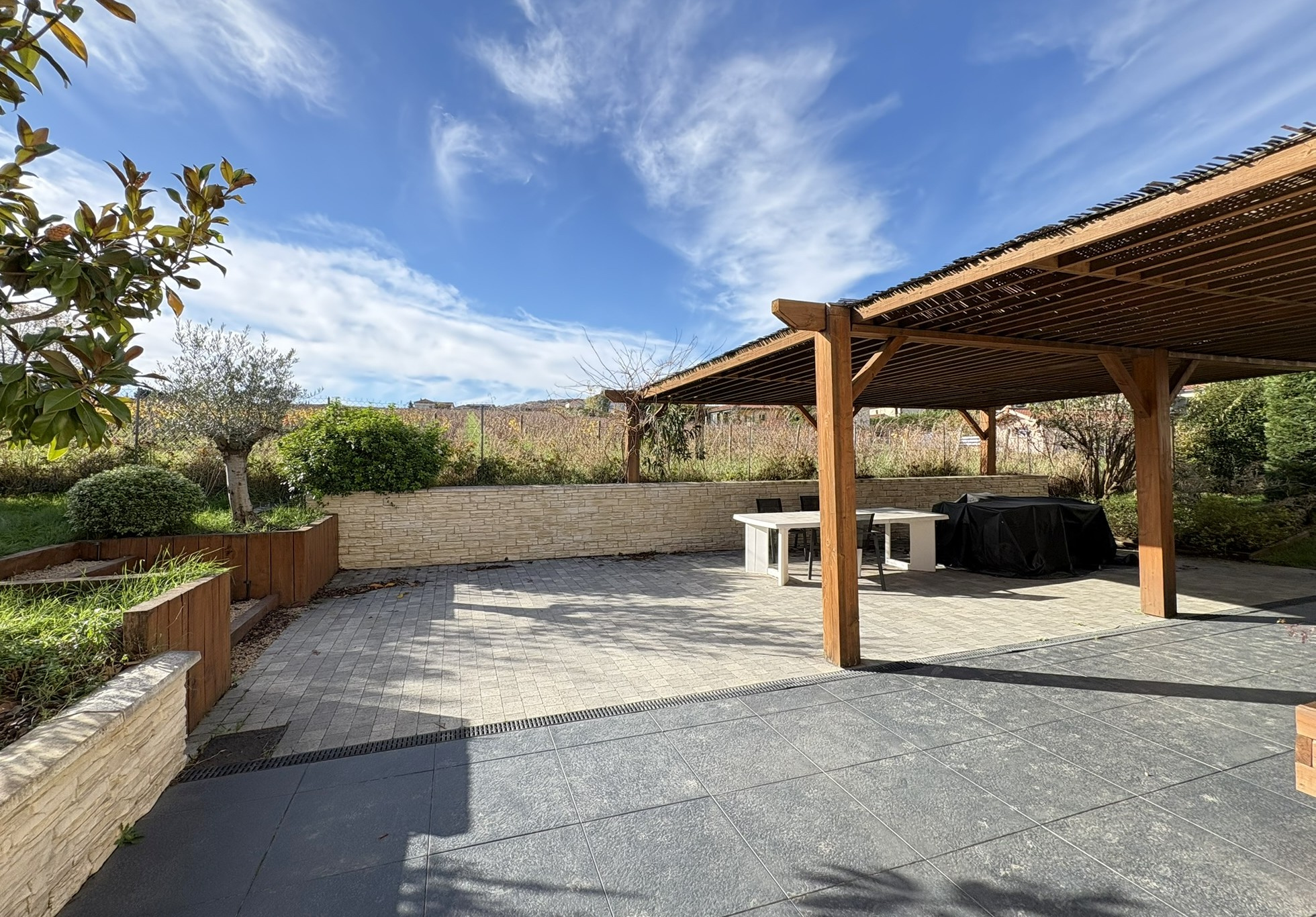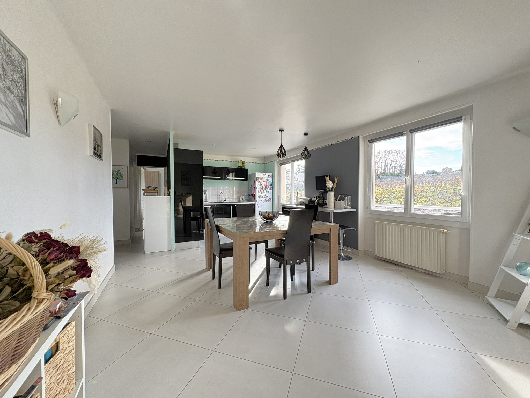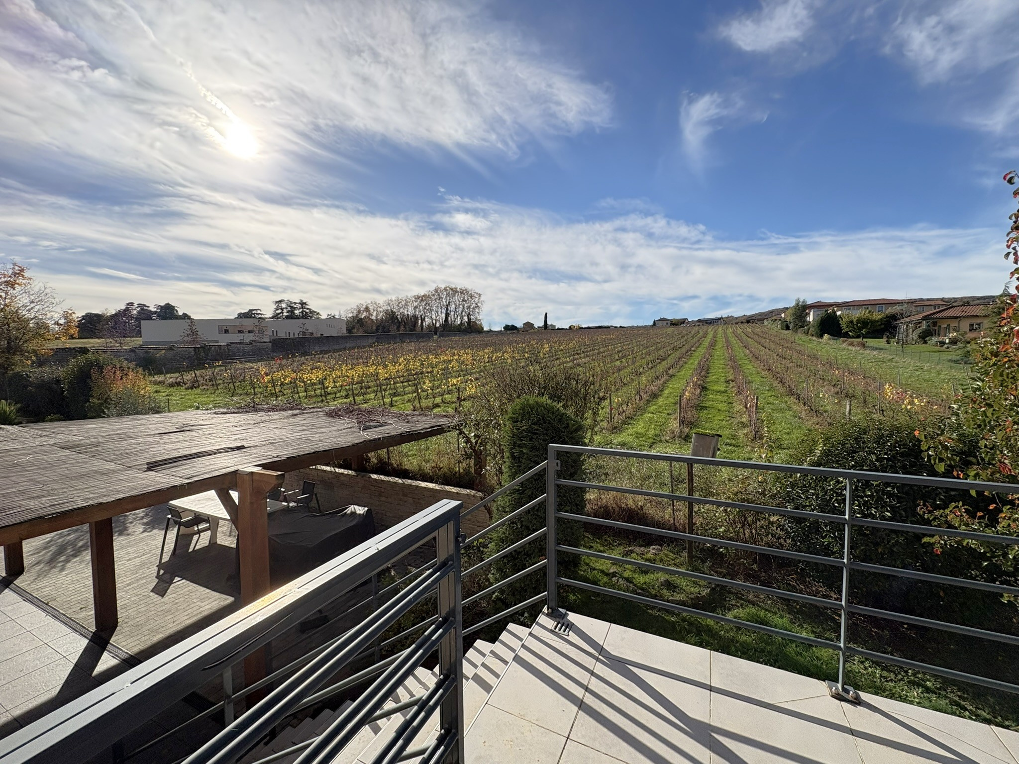 A l’extèrieur deux terrasses carrelées avec vue imprenable sur les vignes (exposition SUD/OUEST), (une au premier niveau avec accès pièce de vie et une au rez-de-chaussée), une grande cour de stationnement et le tout sur un terrain d’environ 1517m2.