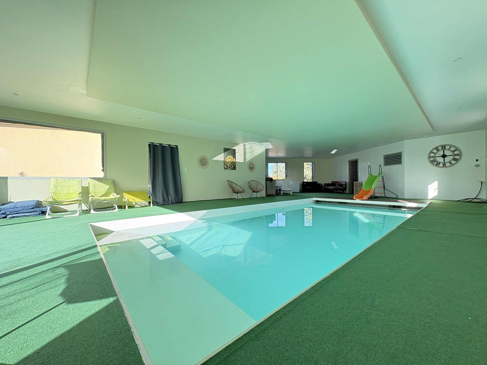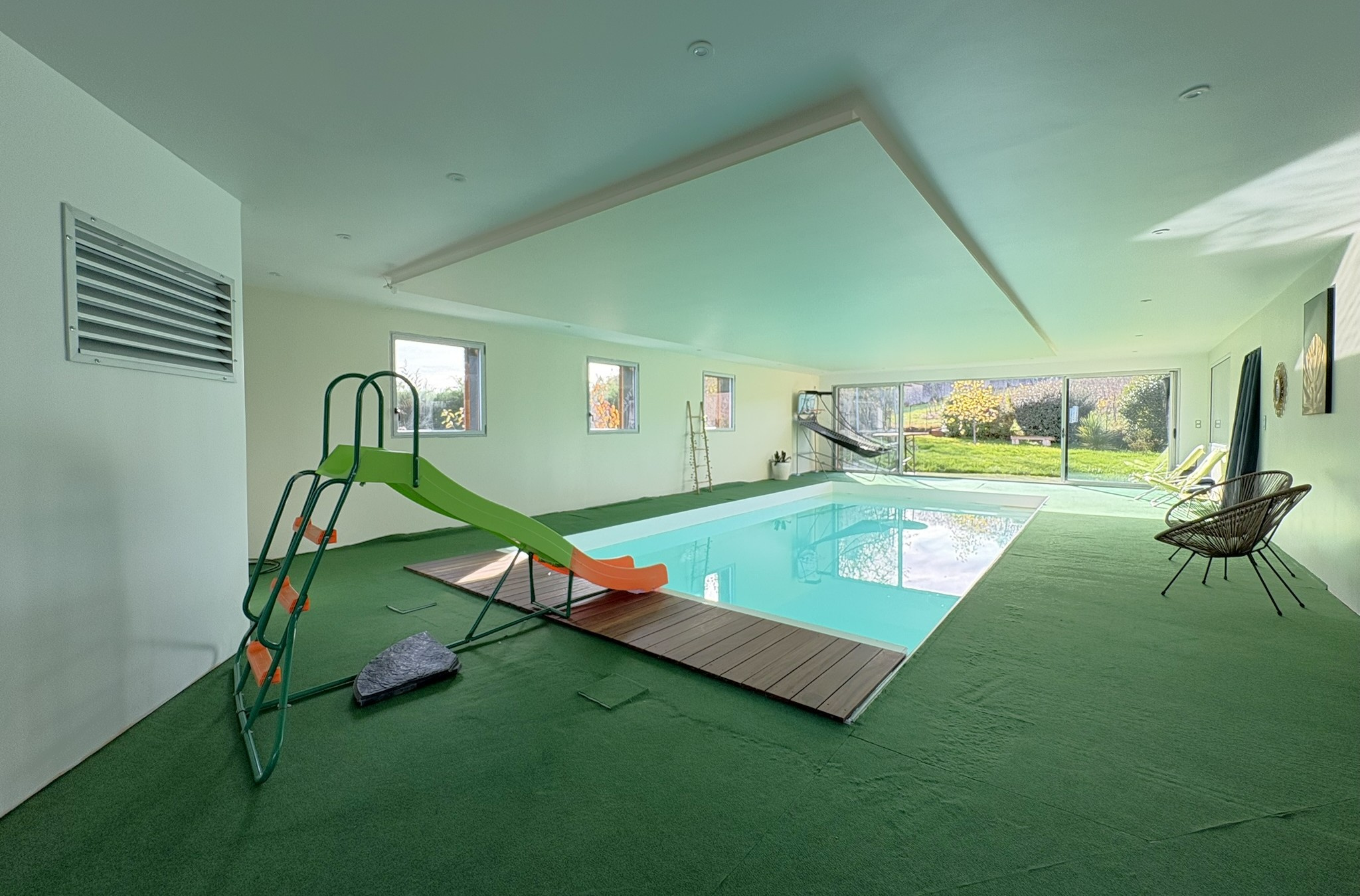 Accolé et attenant une magnifique espace détente d’environ 145 m2 avec piscine chauffée (volet immergé et PVC armé), une salle d’eau avec wc et un local technique.