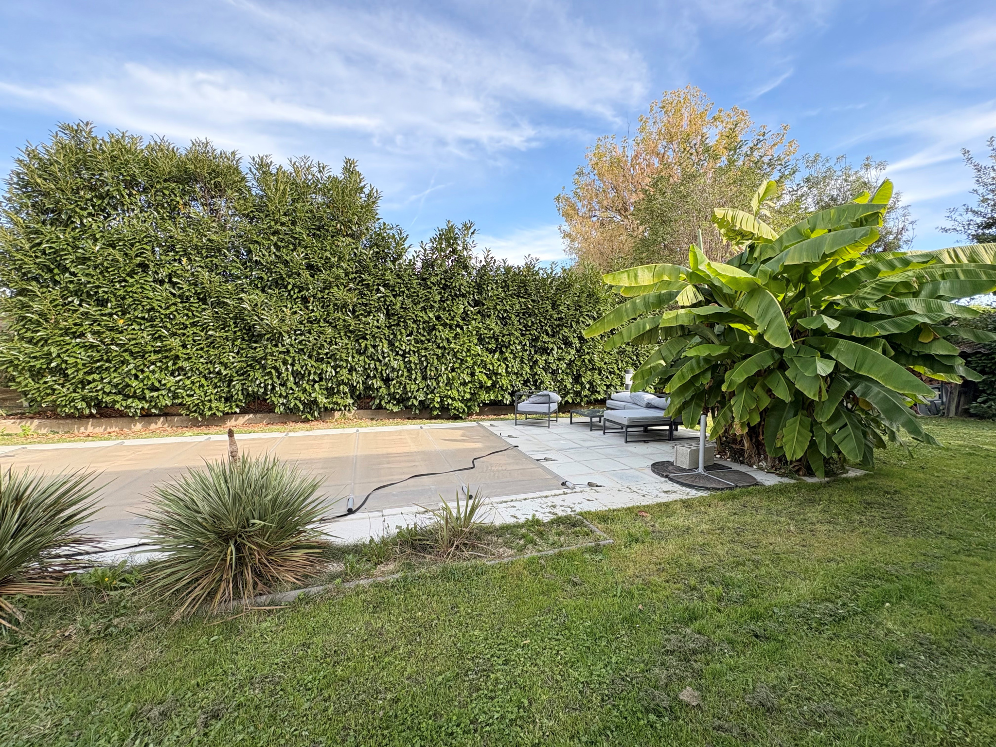 A l’extérieur, une piscine sécurisée, terrasse et une cour à l’entrée.