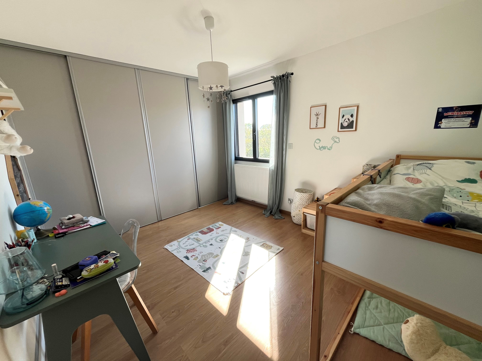 A l’étage, un dégagement desservant trois belles chambres (12.2 13.3 et 14.8m2) toutes équipées de rangement et une salle de bains + WC.