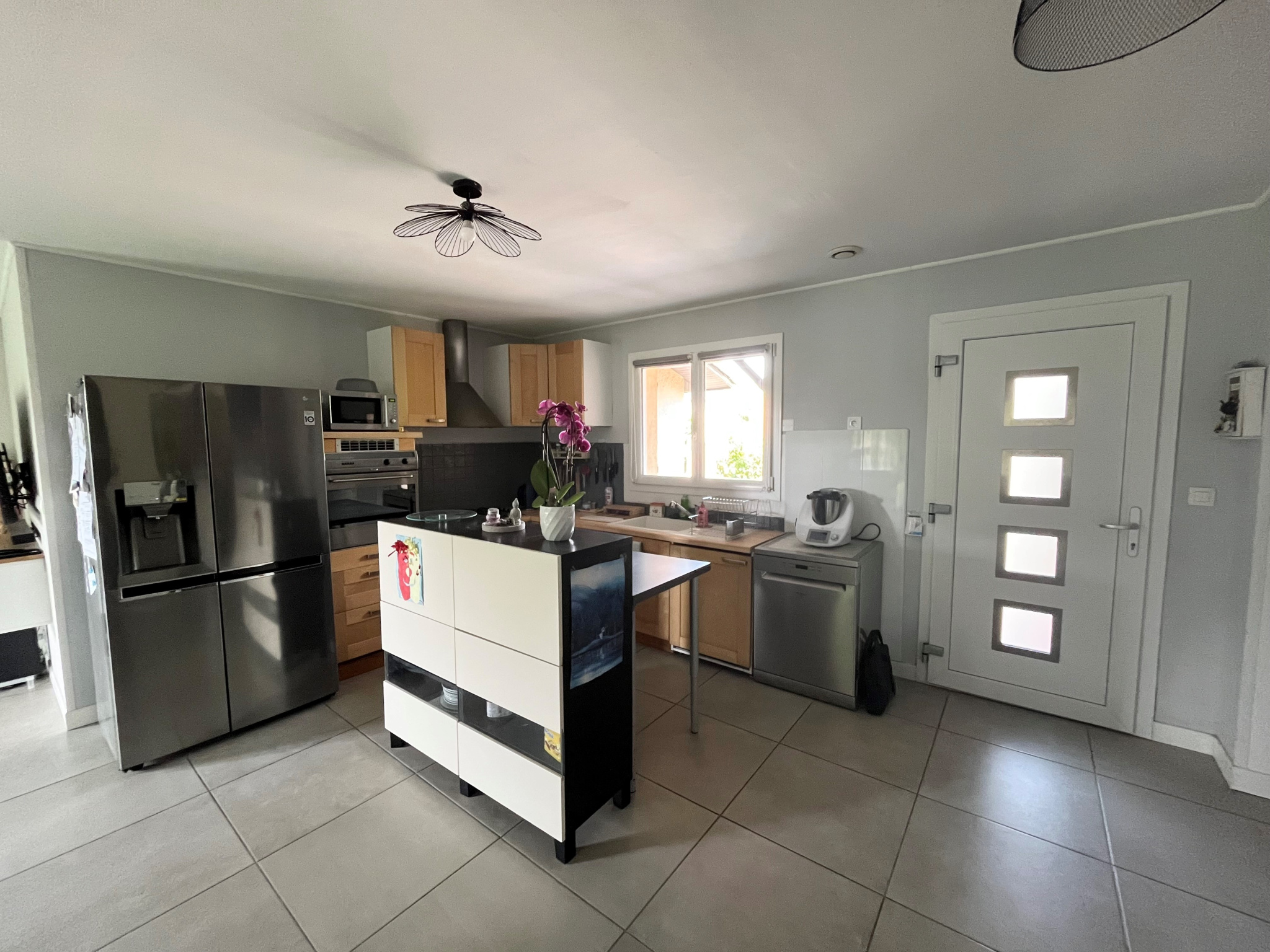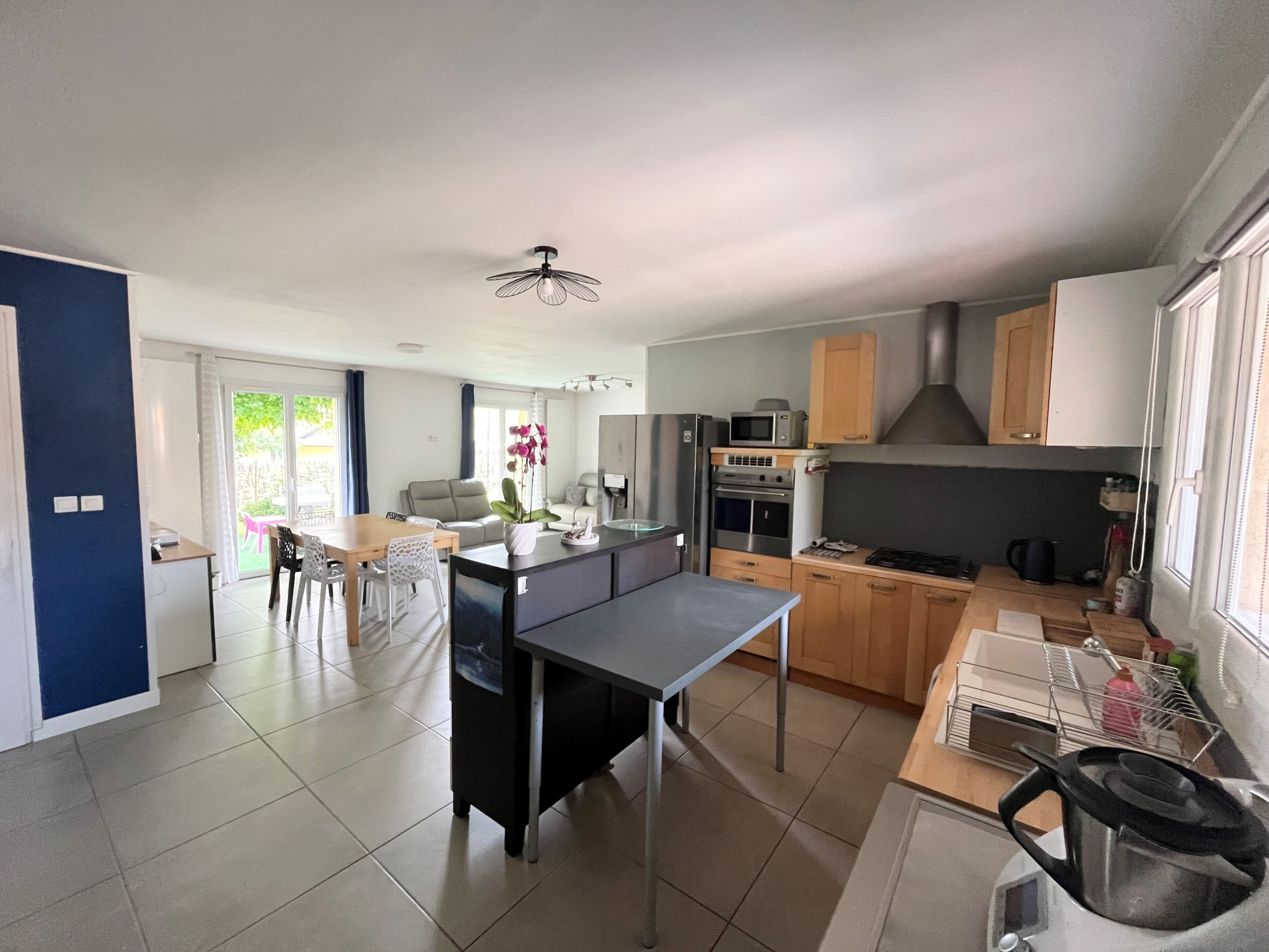Elle se compose d’une entrée donnant sur un séjour/salle à manger avec cheminée à insert, une cuisine ouverte, une buanderie avec espace cellier, un dégagement desservant trois chambres et une salle de bains.