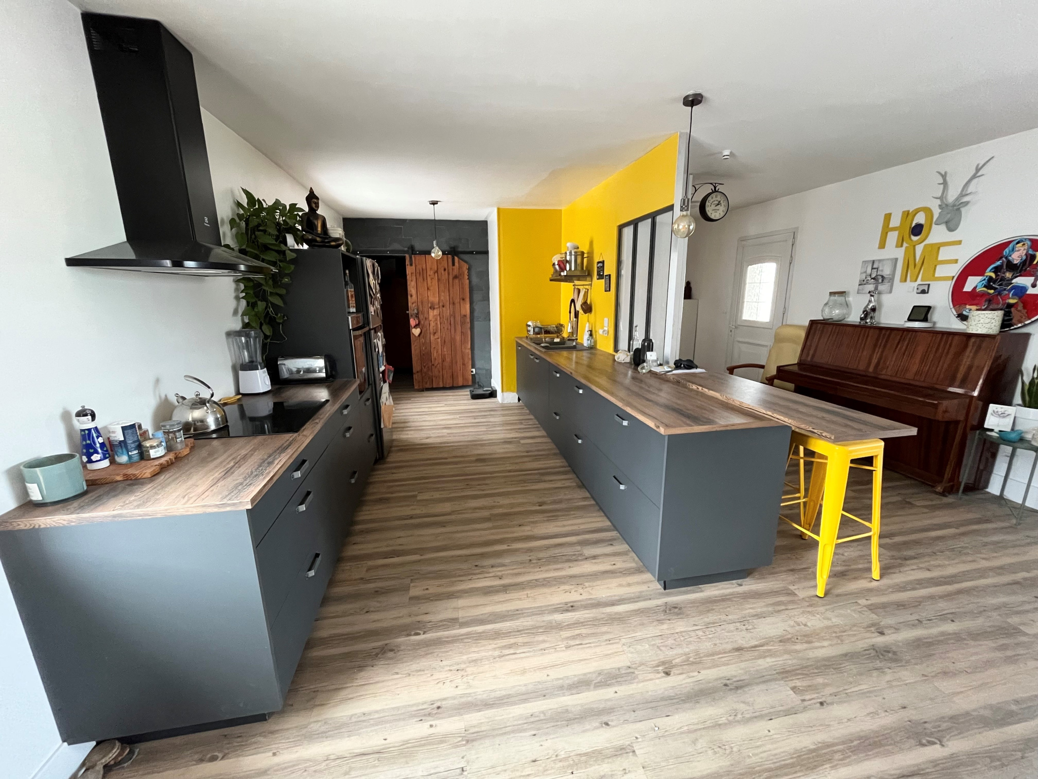 Elle se compose au rez de chaussée d’une entrée donnant sur l’espace repas avec cuisine ouverte équipée soit environ 44m2, un cellier et un salon de 25m2.