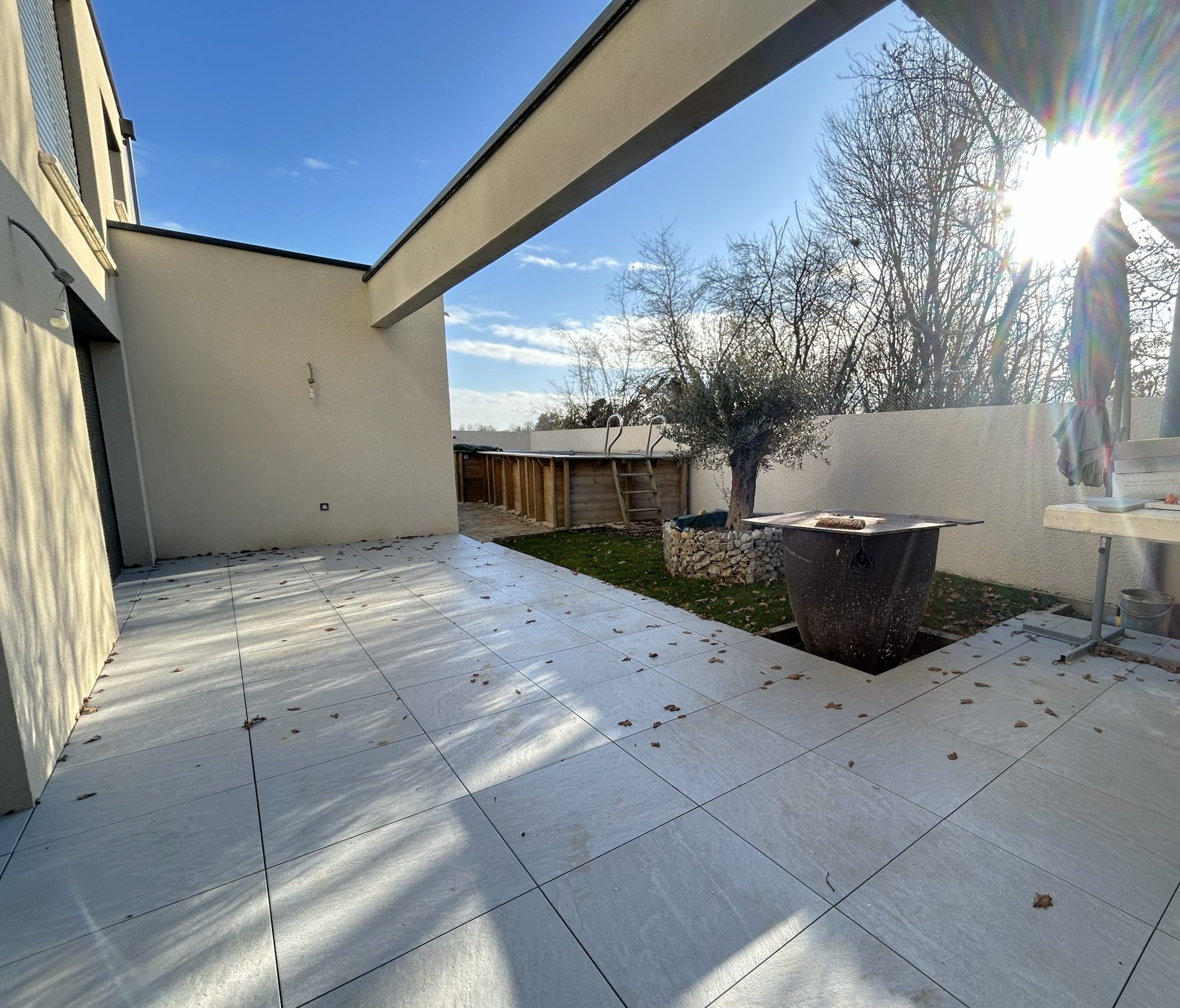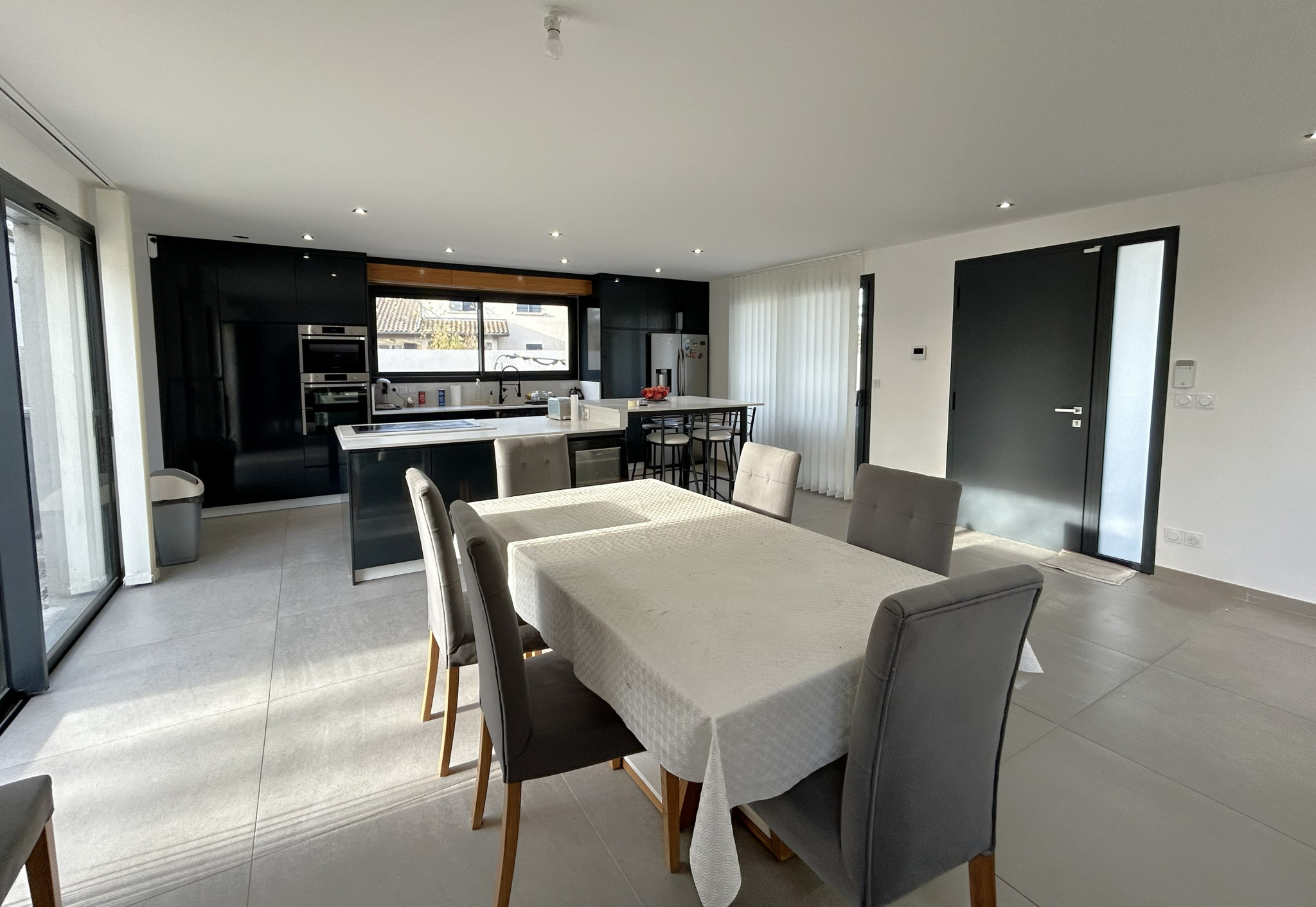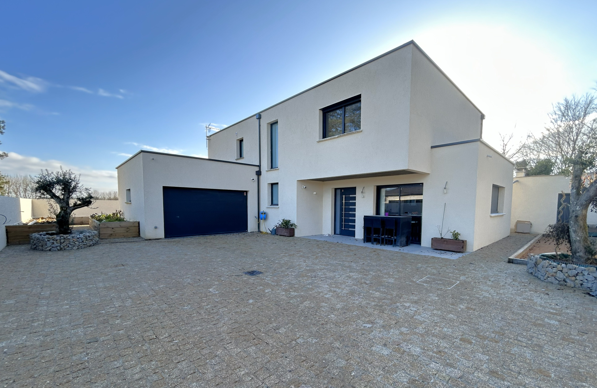 François Mathieu Immobilier – Maison moderne de 2022 d’environ 187m2 avec garage et piscine, le tout sur un terrain d’environ 643m2.