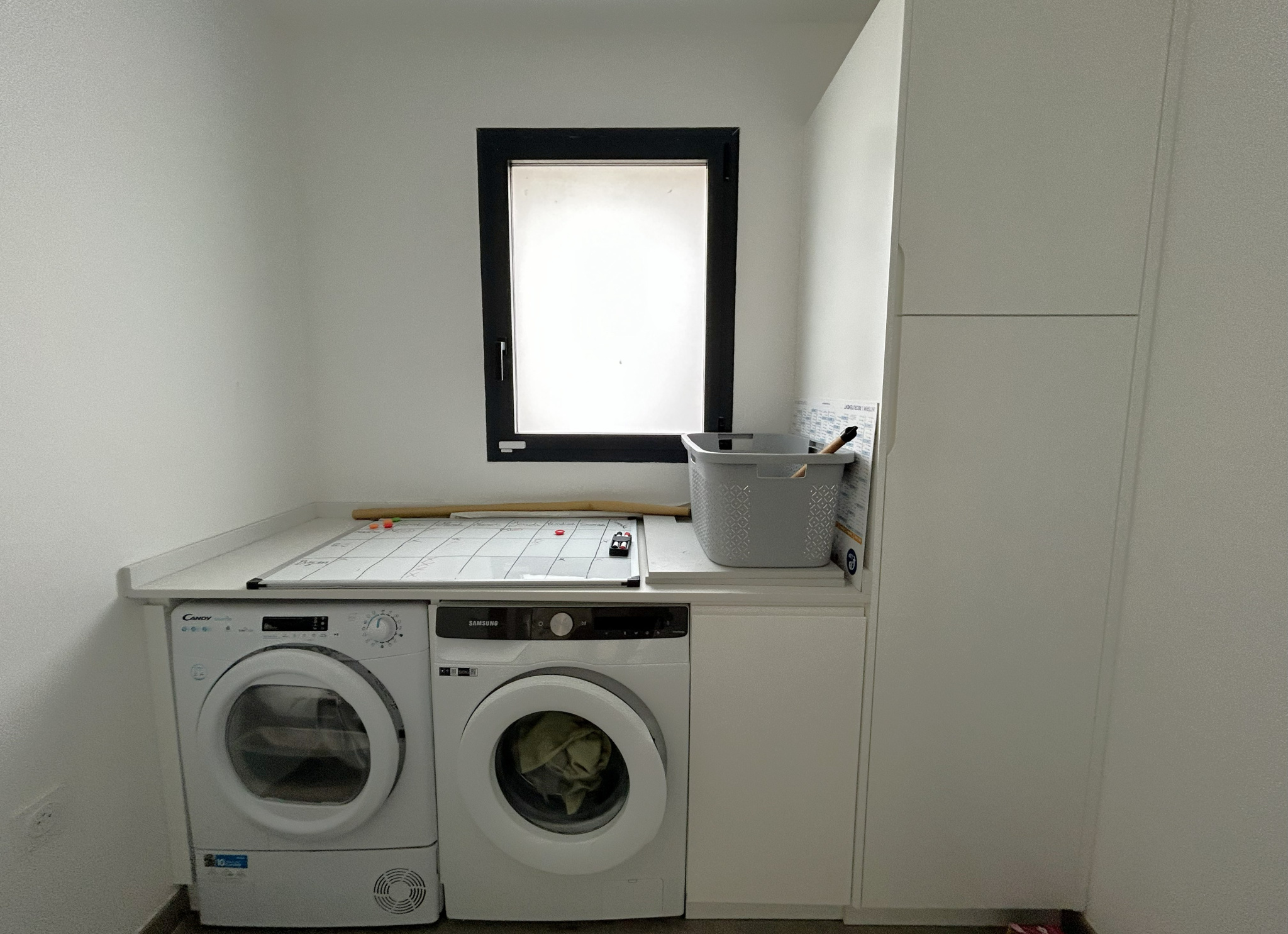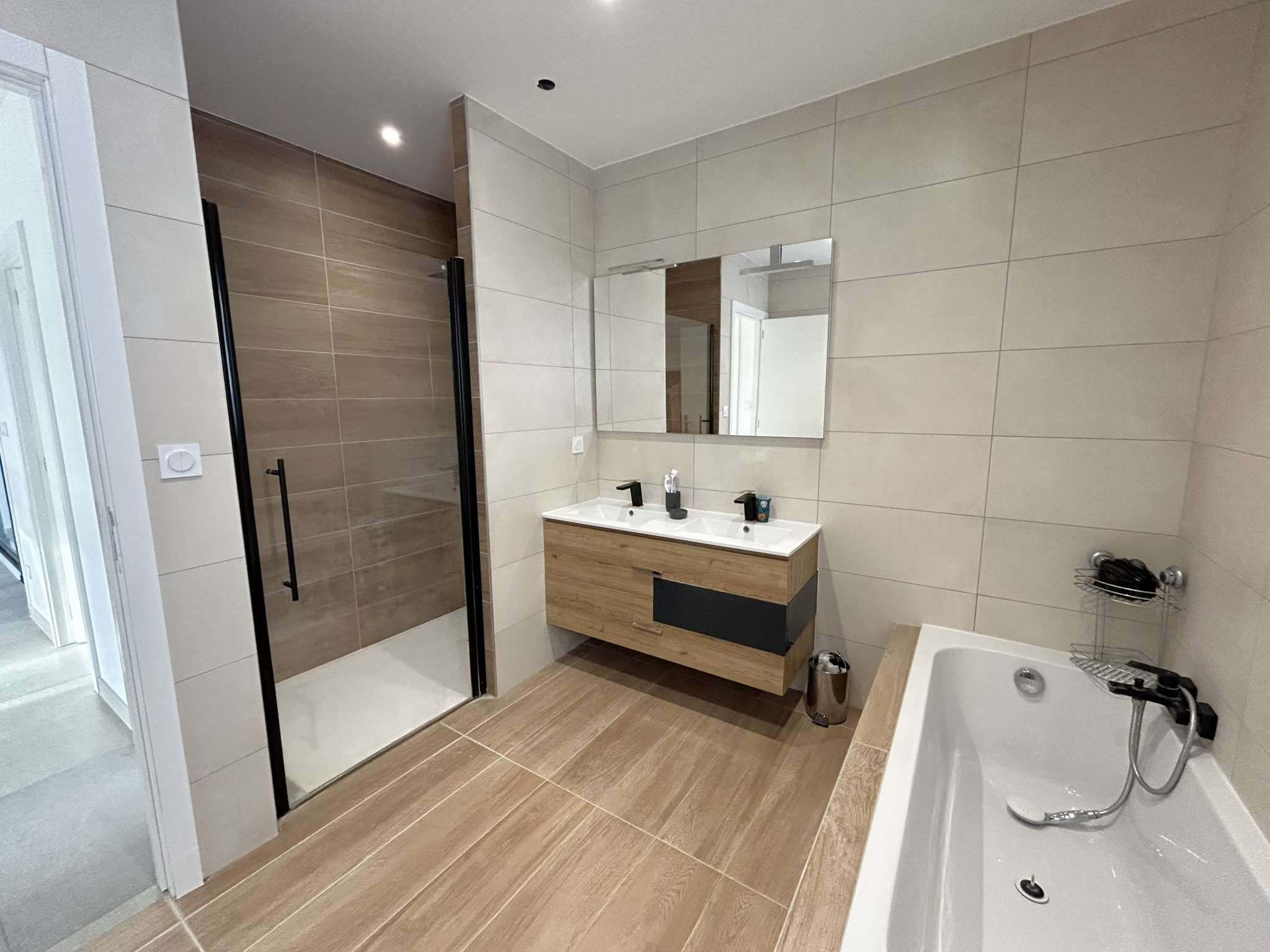 Maison qui se compose au rez-de-chaussée d’une spacieuse et lumineuse pièce de vie (environ 69m2) avec cuisine ouverte et équipée, un dégagement donnant sur une suite parentale avec dressing, salle d’eau et wc, une buanderie et un second wc.