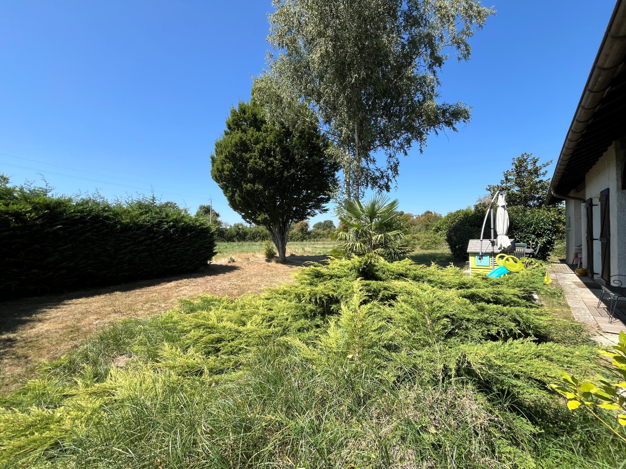 A l’extérieur, un garage d’environ 29m2 (+ mezzanine pour stockage), terrasse à l’Ouest et une cour à l’entrée. Jardin arboré !