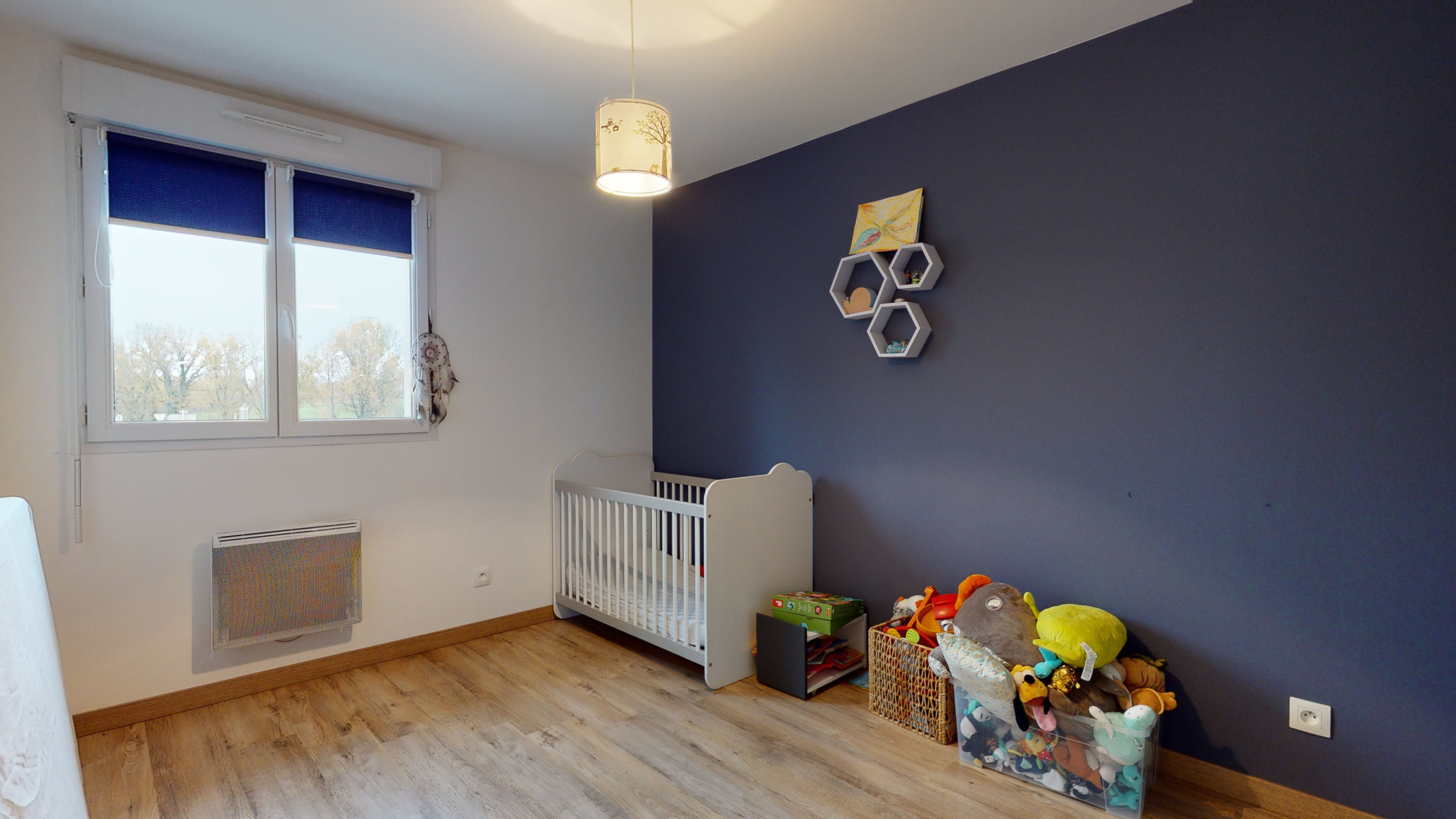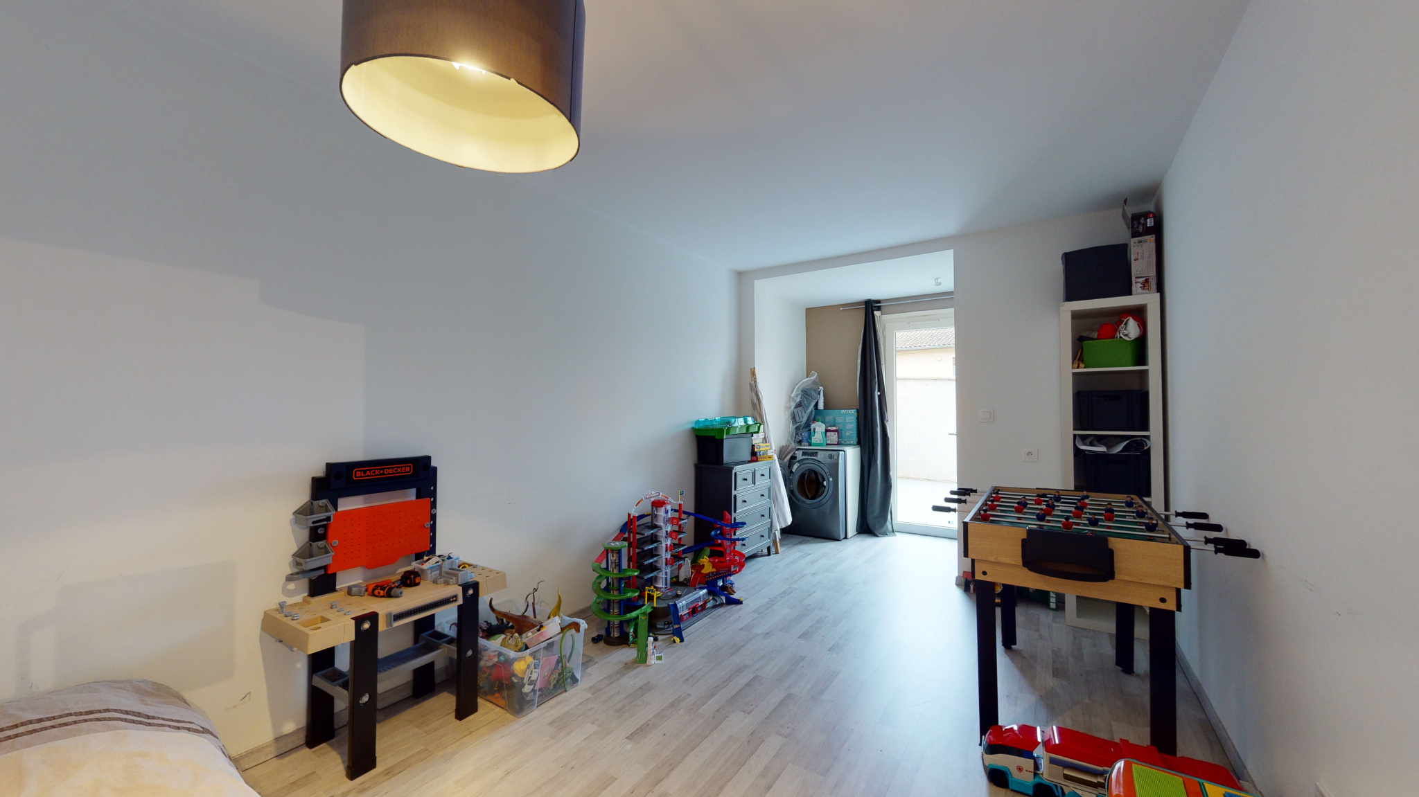 Elle se compose au rez-de-chaussée d’une entrée avec placard, un salon/séjour avec cuisine ouverte et équipée, une salle de jeux (pouvant être utilisée en chambre), une buanderie et un wc.